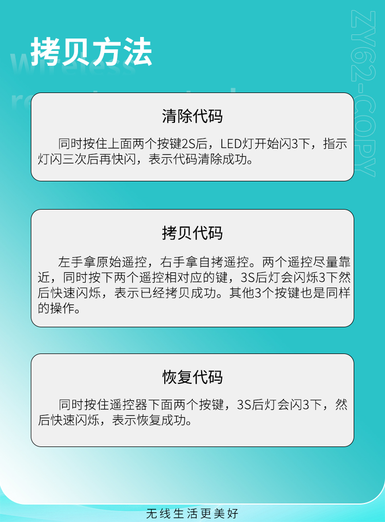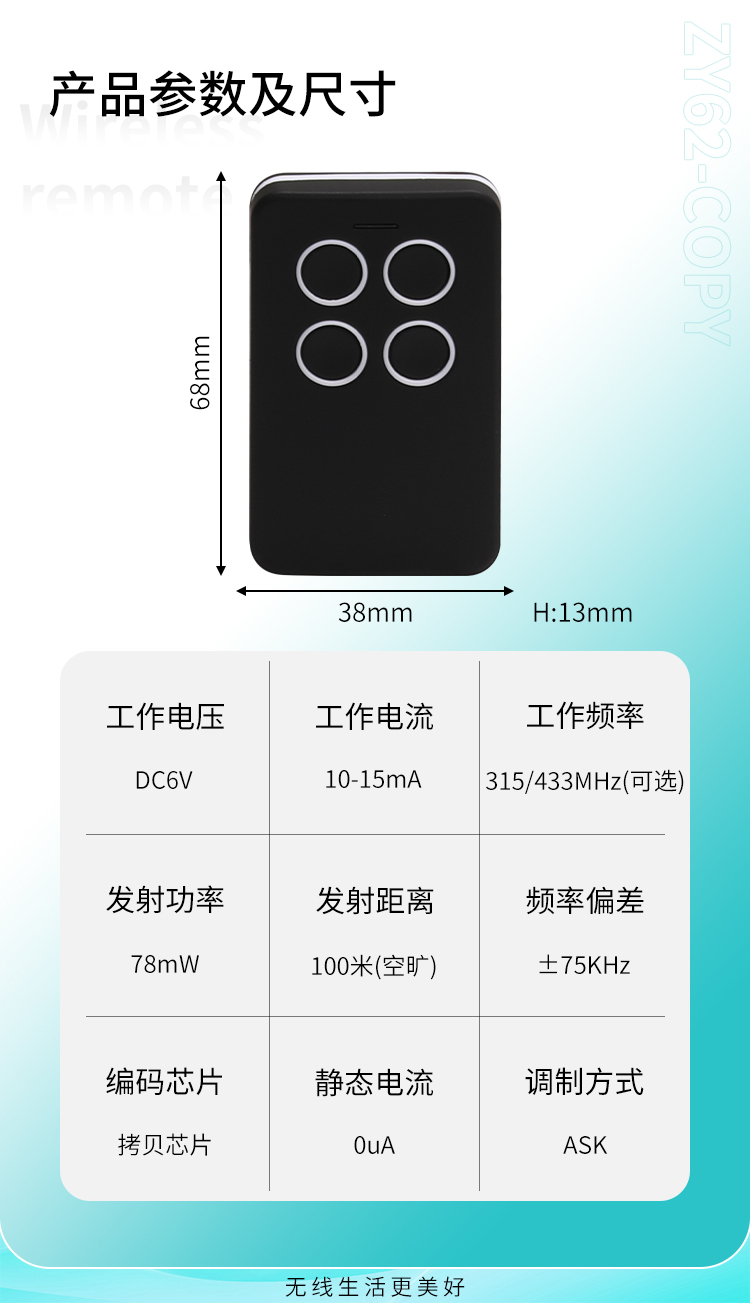 ZY62-COPY是一款具有4个触发按键的91短视频版在线观看免费遥控器,。ZY62-COPY91短视频版在线观看免费遥控器,可拷贝同频率的遥控器,外观精美,具有可靠性高、频率稳定、穿透能力强等特点;