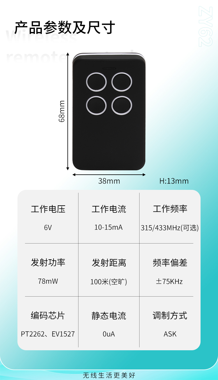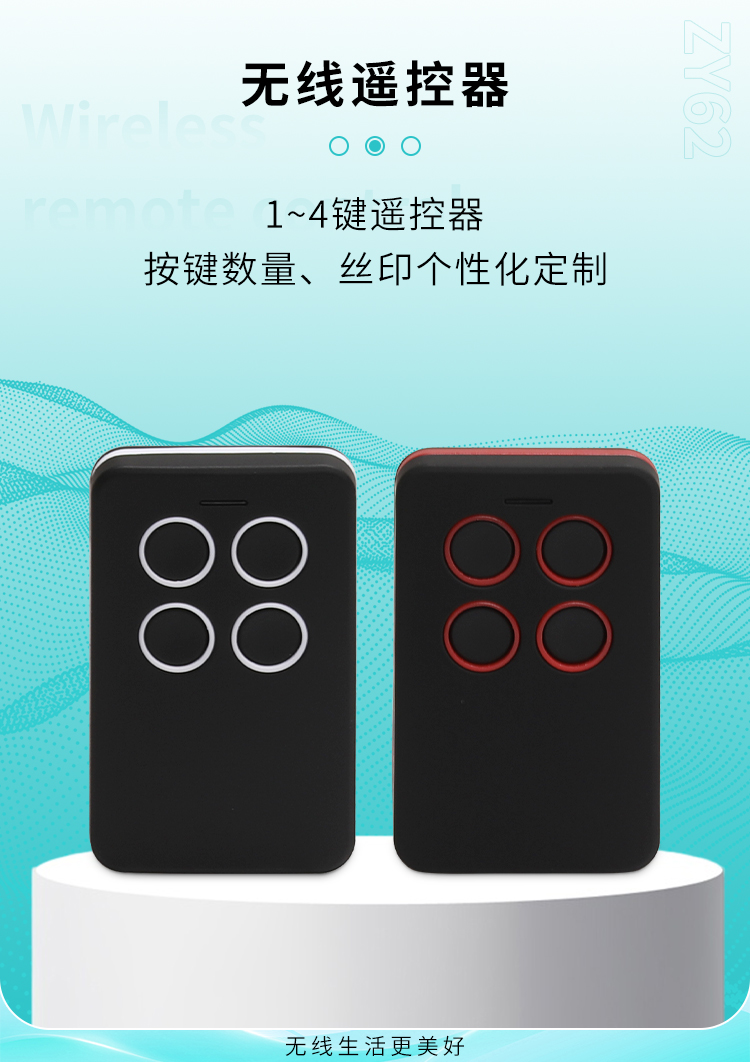 ZY62-4是一款具有4个触发按键的91短视频版在线观看免费遥控器,可以跟本公司的接收模块或控制器配套使用;也可以单独为客户91短视频下载色版APP,一般91短视频下载色版APP于91短视频版在线观看免费电设备的遥控;如节能灯光、家庭防盗系统、工业或家庭遥控控制等。ZY62-491短视频版在线观看免费遥控器,具有可靠性高、频率稳定、穿透能力强等特点;其内部电路设计采用声表面谐振器稳频,全部采用SMD工艺,频率315MHZ或433MHZ可选,编码芯片采用EV1527,供电电源采用内置CR2016两节共6V电池供电。