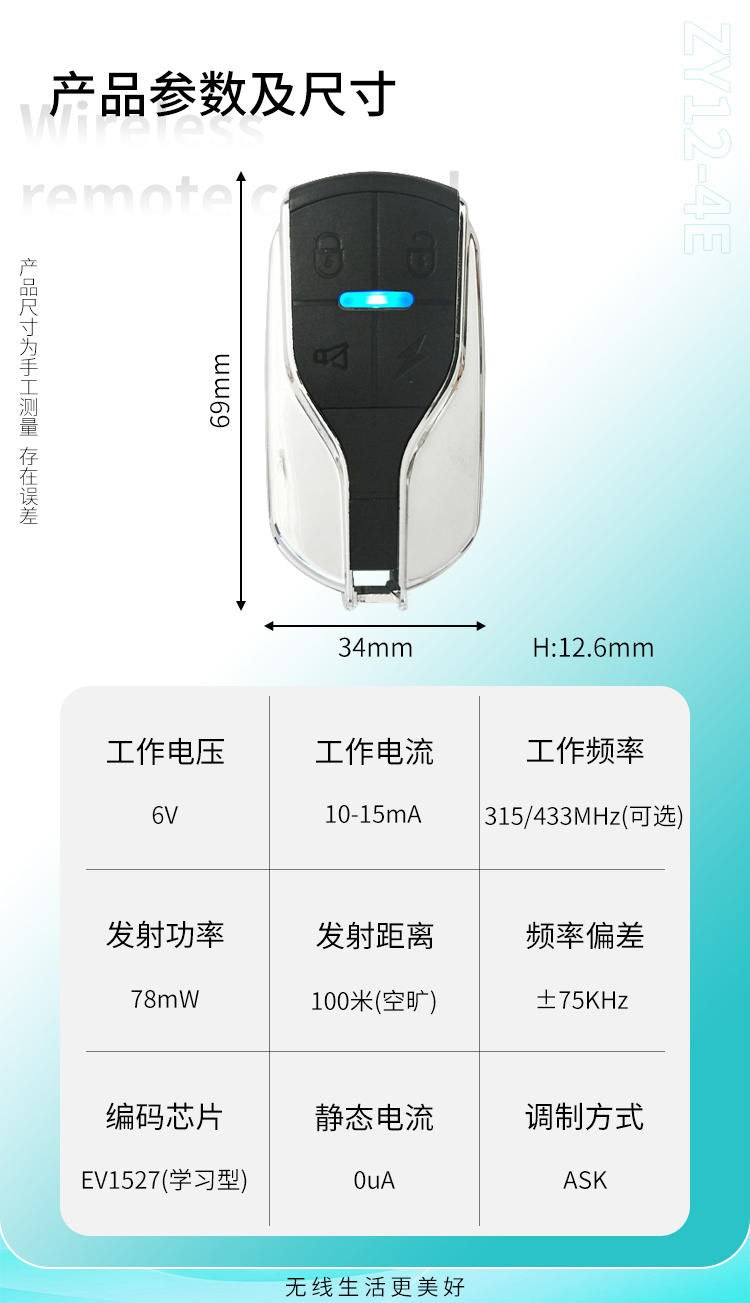 ZY12-4E是一款小功率91短视频版在线观看免费遥控器,具有可靠性高、频率稳定、穿透能力强等特点;