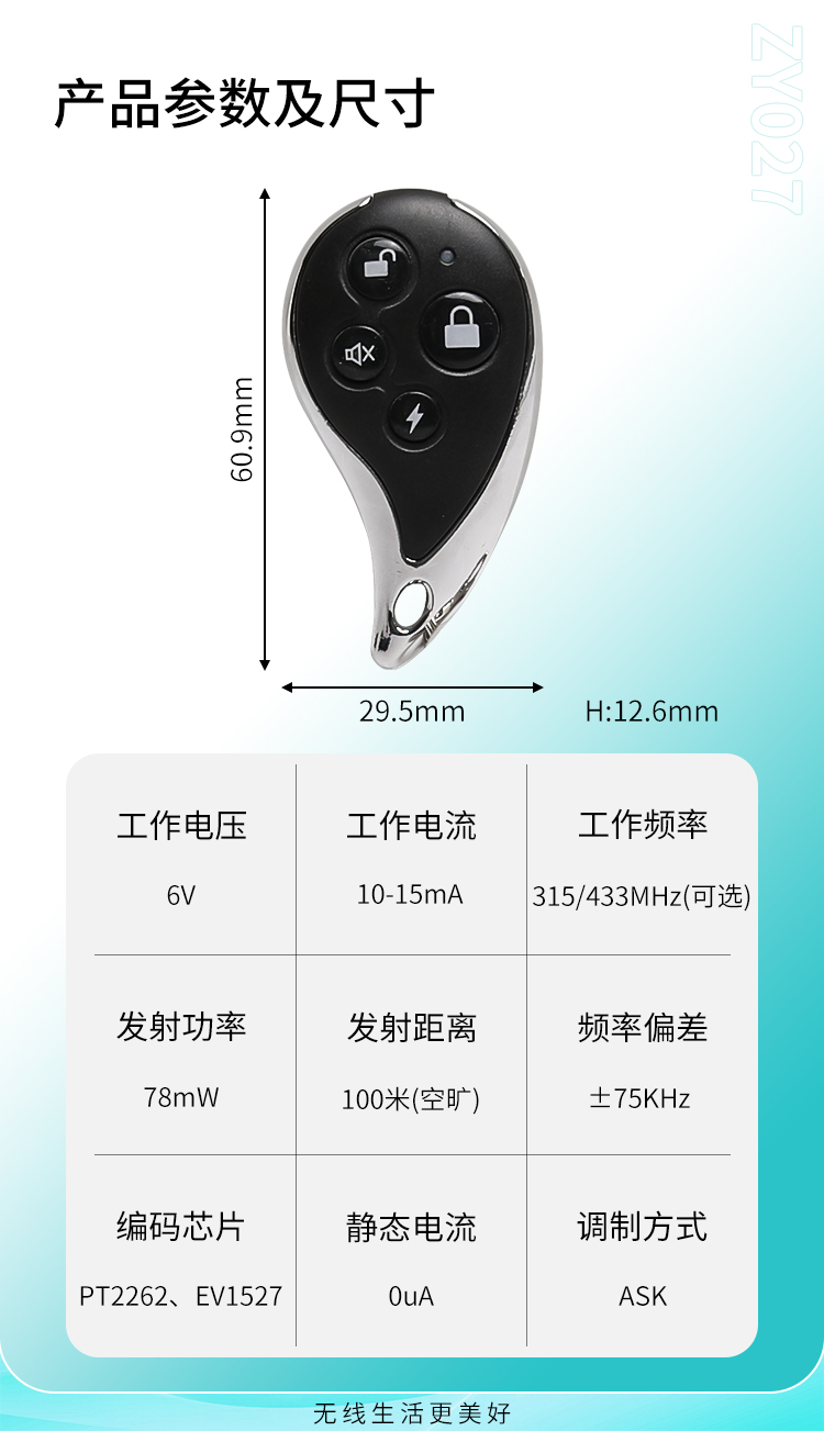 ZY027是一款小功率91短视频版在线观看免费遥控器,具有可靠性高、频率稳定、穿透能力强等特点;