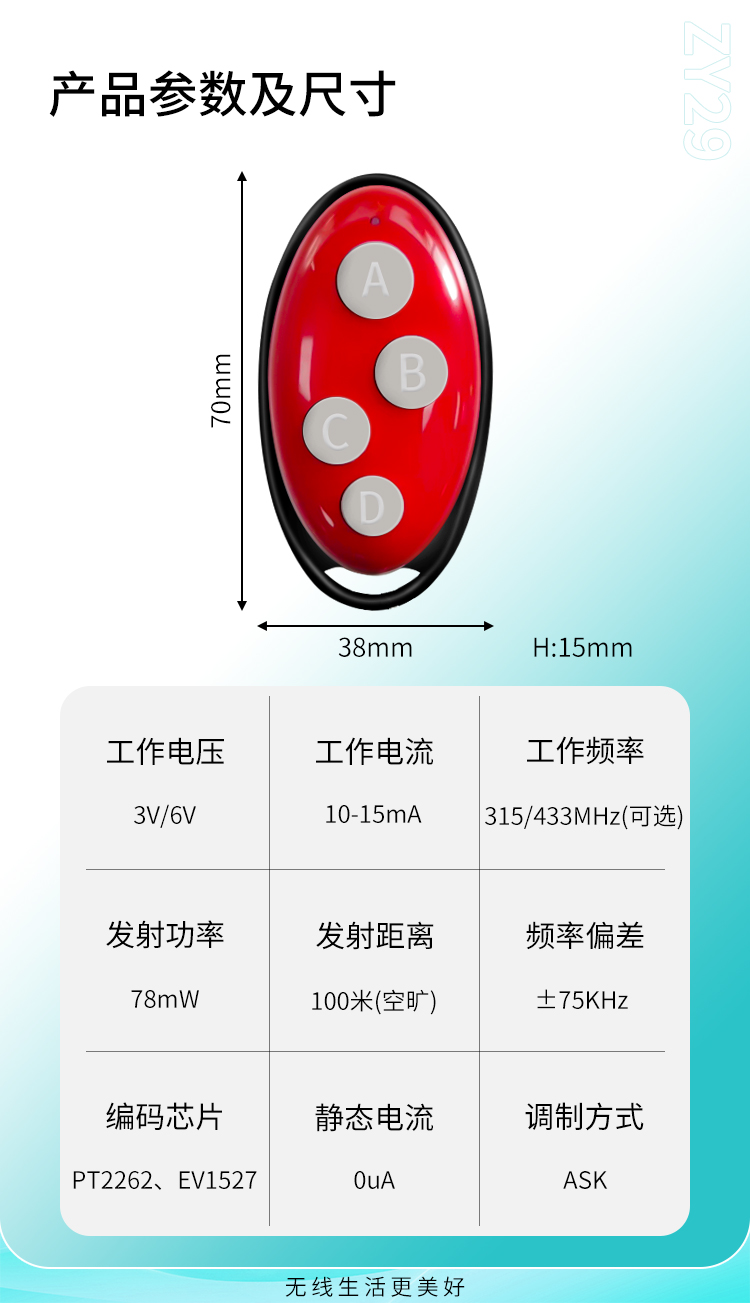 ZY29是一款小功率遥控器,外观精美,具有可靠性高、频率稳定、穿透能力强等特点;