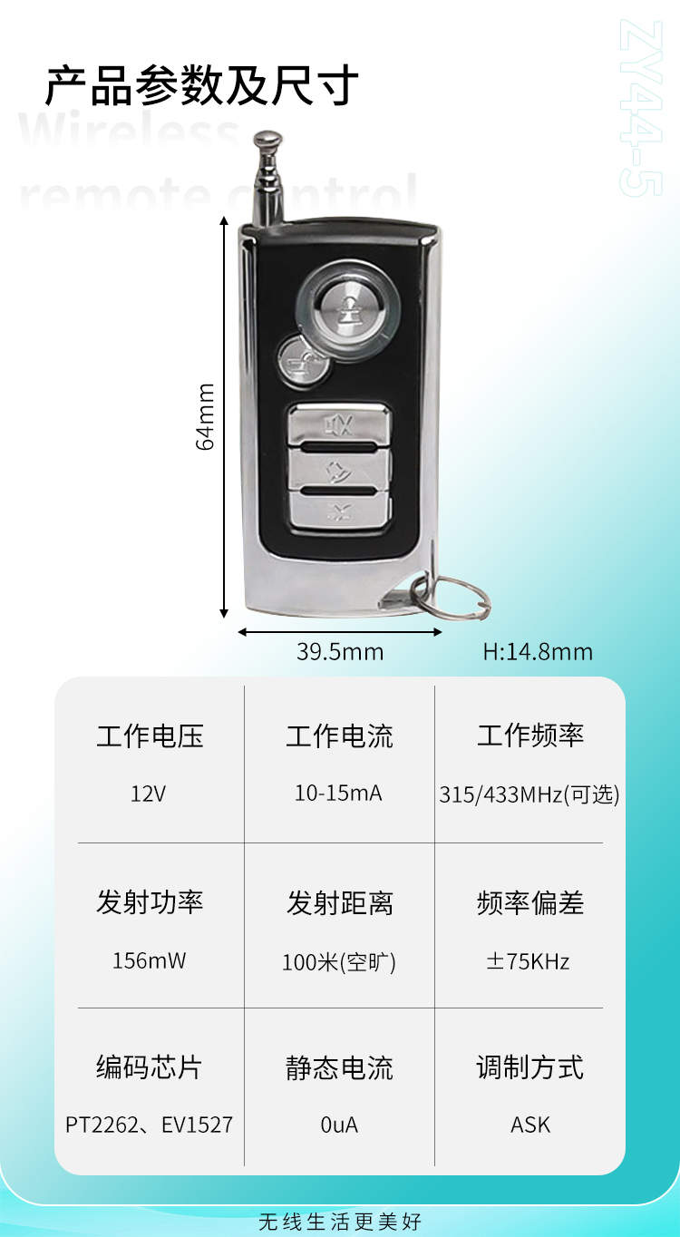 ZY44-5是一款小功率91短视频版在线观看免费遥控器,5个按键。具有可靠性高、频率稳定、穿透能力强等特点;