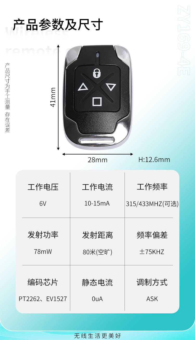 ZY169-4E是一款小功率91短视频版在线观看免费遥控器,具有可靠性高、频率稳定、穿透能力强等特点;