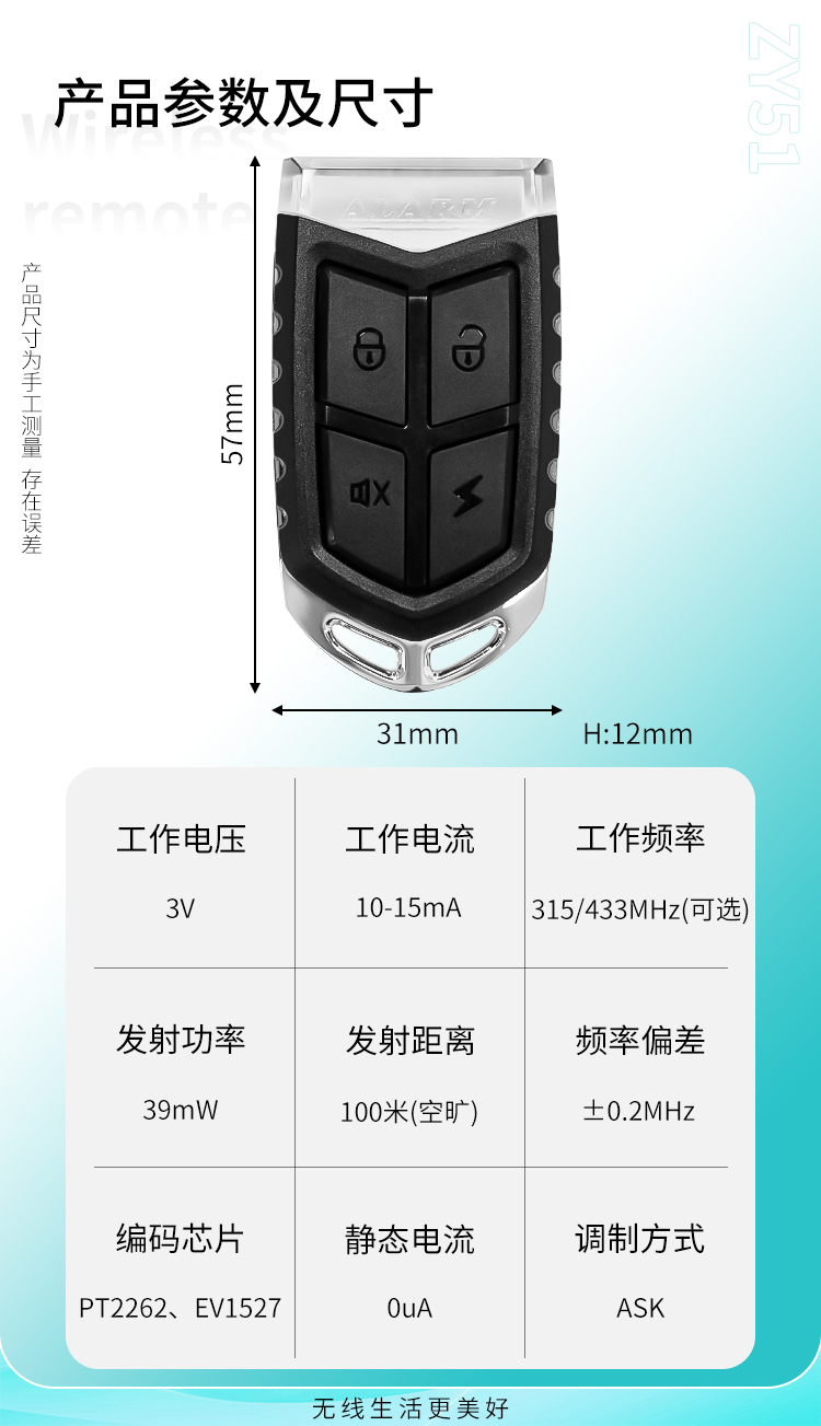 ZY51是一款小功率91短视频版在线观看免费遥控器,外观精致,具有可靠性高、频率稳定、穿透能力强等特点;